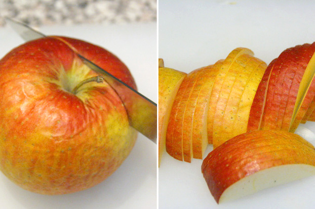 Den Apfel in Scheiben schneiden. Nehmt am Besten eine säuerliche Apfelsorte, als Kontrast zu den karamellisierten Zwiebeln.