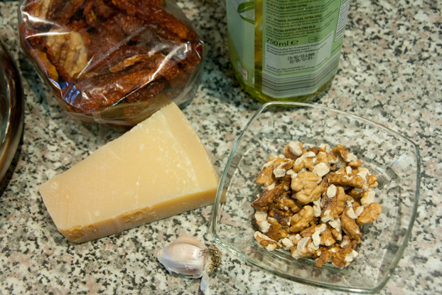 Wir brauchen: Walnüsse, getrocknete Tomaten, Parmesan, Olivenöl, Knoblauch, Salz und Pfeffer.