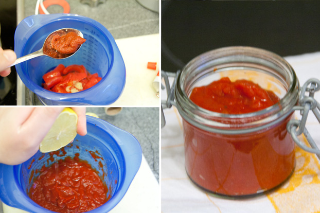 Den Sternanis entfernen. Paprika und Knoblauch aus dem Sud fischen und in einem hochwandingen Gefäß mit Tomatenmark pürieren. Esslöffelweise Sud hinzufügen und pürieren, bis eine ketchupartige Konsistenz entsteht. (Vorsicht, nach dem Erkalten dickt das Ketchup noch nach!) Das Ketchup mit Salz und Zitronensaft kräftig abschmecken. In sterilen Gläsern abfüllen und im Kühlschrank lagern.