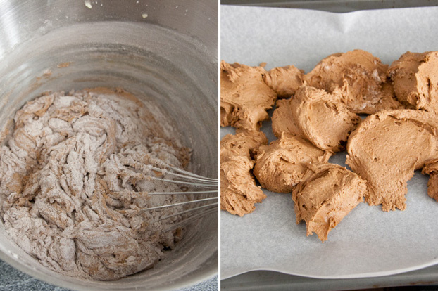Der Teig ist sehr klebrig und lässt sich schwer verstreichen. Um ihn ebenmäßig auf dem Backpapier verstreichen zu können platziert erstmal portionsweise Teigklumpen auf einen mit Backpapier ausgelegten Backblech. Mit bemehlten Fingern den Teig gleichmäßig auseinanderdrücken, das ein ca. 1cm hohes Rechteck entsteht. Ein bisschen Mehl reicht schon damit die Außenschicht des Teigs ihre Pickigkeit verliert.