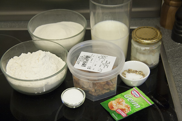 Für das Grammelbrot brauchen wir: eine große Kartoffel, Milch, Schmalz, Zucker, Trockengerm, griffiges Weizenmehl, Weizenmehl, Koriandersamen, Fenchelsamen, Anis, Salz, Grammeln, Mehl und Schmalz zum Ausfetten der Form.