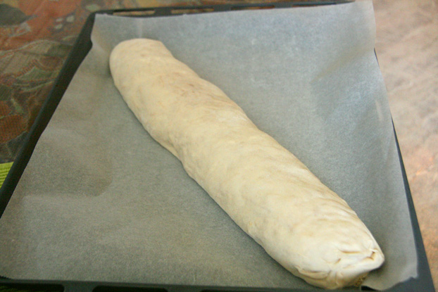 Die Ränder abschneiden und gut verschließen. Ich drehe den Teig wie eine Kordel zusammen und drücke ihn dann fest. Hauptsache es kann nicht aufgehen.