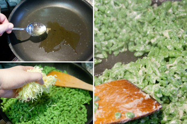 - Die Spätzle in einer Pfanne in ein wenig Zwiebelbutter schwenken, dann die Pfanne von der Hitze nehmen und den Käse einrühren, bis er Fäden zieht. Mit Salz und Pfeffer würzen.