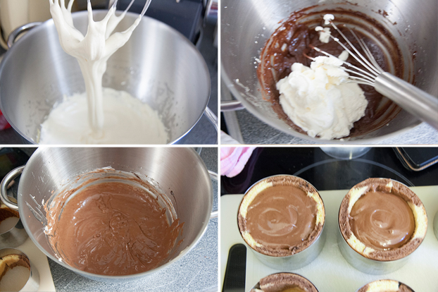 - Das Biskuit in Streifen schneiden und kleine Tortenringe damit auslegen. Die Mousse einfüllen und im Kühlschrank für ein paar Stunden kalt stellen, bis die Schokolademousse starr ist.